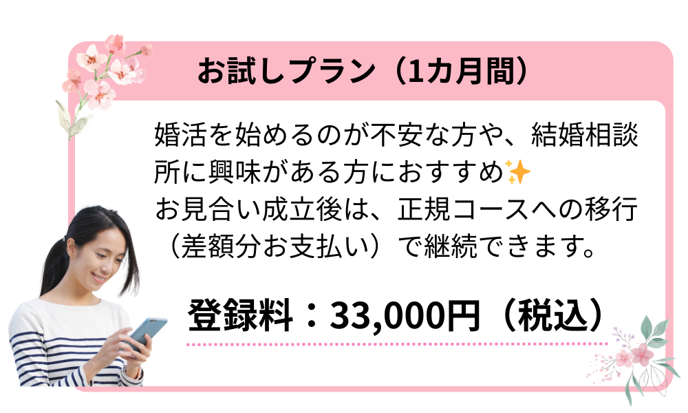 なお、契約上のご成婚日は「婚約(口約束含む)」「宿泊を伴う旅行」「結納」「 婚前交渉」「同棲」のいずれか早い日となります。